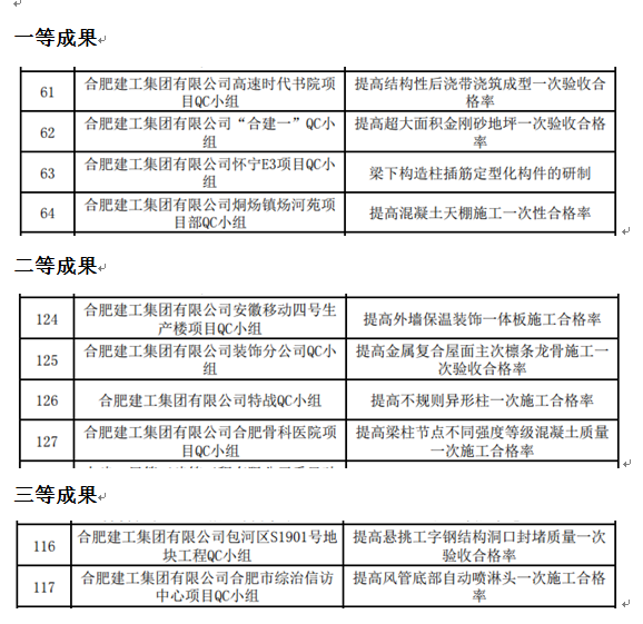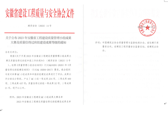 近日,安徽省建設行業質量與安全協會公布了2023年安徽省工程建設質量管理小組及信得過班組建設活動成果獲獎名單,合肥建工申報的10項QC小組活動成果榮獲省級QC成果獎。
